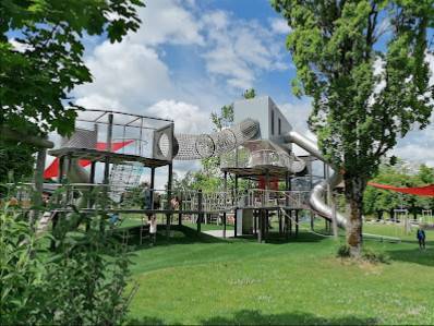 Die Matschzone bietet sowohl Schatten als auch Spielspaß und ist ideal für Kinder, die ihren Kreativität freien Lauf lassen möchten. Die Kletteranlagen sind ebenfalls sehr beliebt, mit einer Seilbahn und Rutschen, die die Kleinen begeistern. Zusätzlich zu diesen Annehmlichkeiten verfügt der Spielplatz über öffentliche Toiletten, Trinkwasserspender und ein Café direkt am Park, damit die Eltern sich entspannen und bei einem Erfrischenes pausieren können.